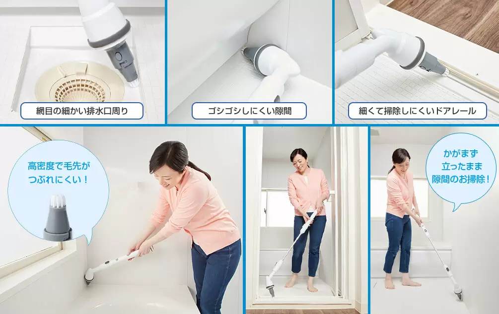 浴槽や床はもちろん、天井まで立ったままラクラクお風呂掃除が出来ちゃう電動そうじブラシなんです!